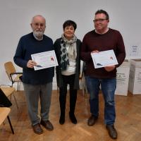 Below is Patricia Donohue, Chair, presenting certificates to Liam O'Connell & Ger Kavanagh, who were winners but absent the week before for the theme "Seascapes" competition.